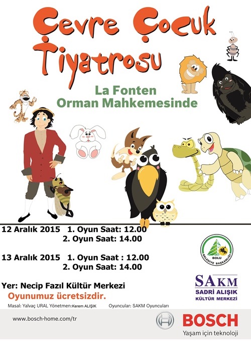 Ücretsiz olarak 17 ili geziyor, çocuklara doğa sevgisi aşılıyor Bosch Çevre Çocuk Tiyatrosu, yeni sezonda perdelerini ilk olarak Amasya’da açtı. Amasya, Çorum, Çankırı, Karabük ve Düzce’nin ardından Zonguldak’a gelen Bosch Çevre Çocuk Tiyatrosu’nun bir sonraki durağı ise Bolu olacak. Ardından Sakarya, Kocaeli, Yalova, Bilecik, Eskişehir, Afyonkarahisar, Bursa, Edirne, Kırklareli’ni gezecek, kapanışı ise Tekirdağ’da yapacak. Böylece La Fonten Orman Mahkemesinde oyunu ile Bosch Çevre Çocuk Tiyatrosu, tüm illerde ücretsiz olarak sahneleneceği Ekim 2015 – Haziran 2016 sezonu boyunca toplamda 17 il gezmiş, 22 hafta sonu ve 88 temsil ile on binlerce çocuk ve ailesine ulaşmış olacak. (ALINTI)