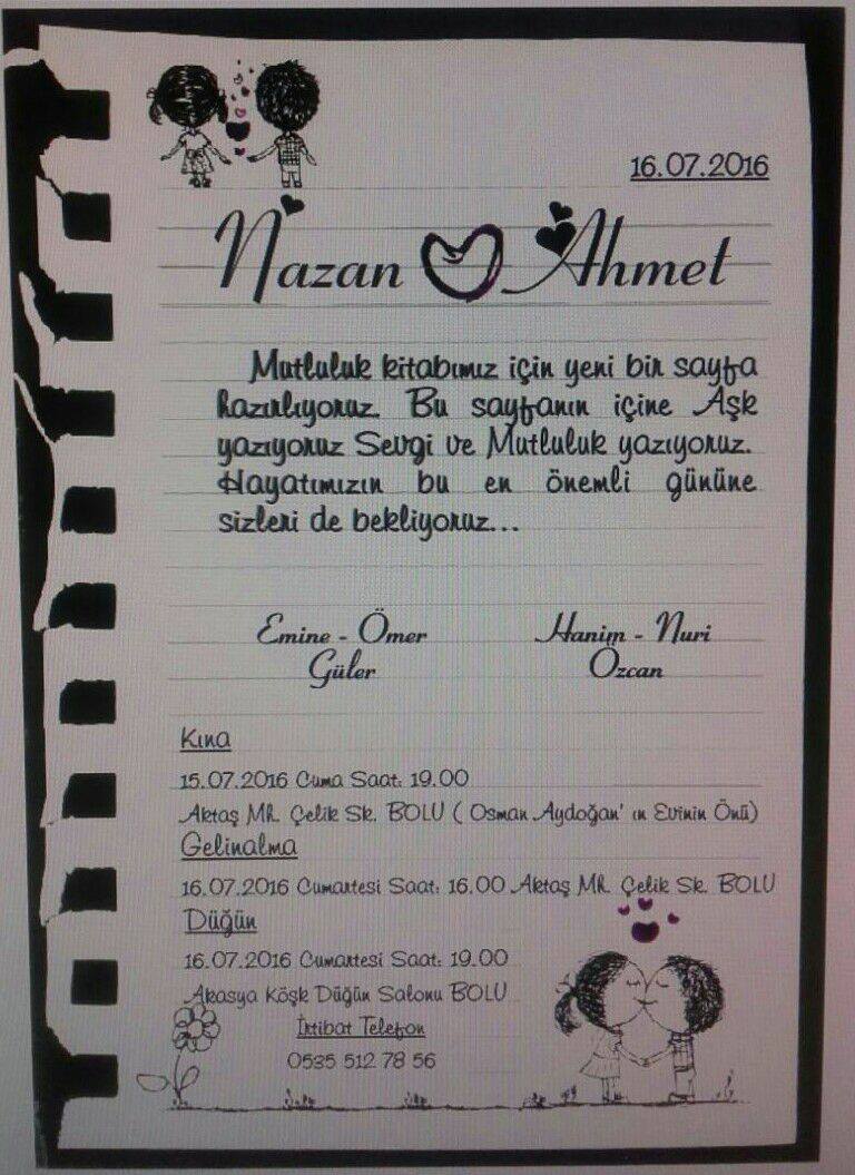 Emine ve Ömer GÜLER in kızı Nazan GÜLER in düğün merasimine köylülerimiz ve bütün sevenleri davetlidir.